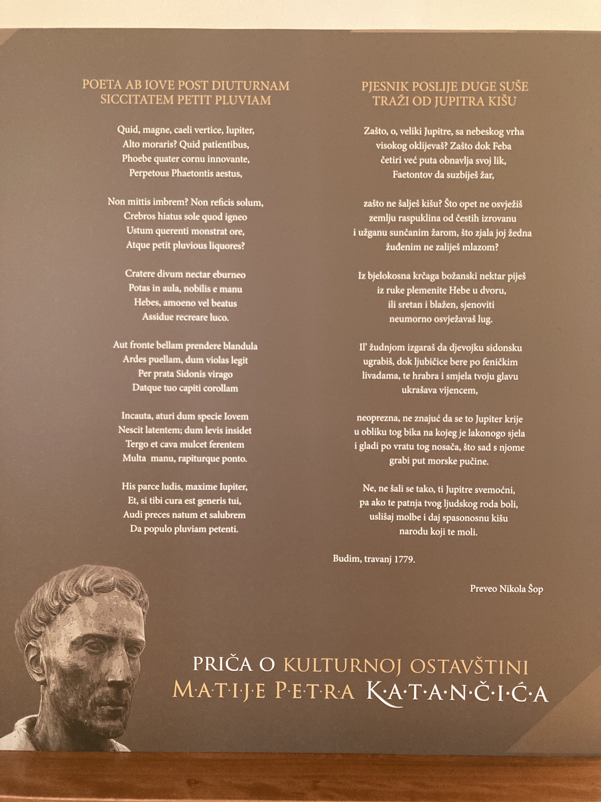 Ukratko o M. P. Katančiću: Bio je hrvatski književnik i latinist, sveučilišni profesor poetike i stihotvorac/versifikator (stručnjak koji proučava strukturu stiha), povjesničar, numizmatičar, kartograf i franjevac. Kao gimnazijski profesor služio je u Osijeku i Zagrebu, a potom je izabran za profesora arheologije na Sveučilištu u Budimu, gdje je i preminuo u franjevačkome samostanu. Katančić je prvi u cijelosti preveo Bibliju na hrvatski jezik (Sveto pismo Starog zakona i Sveto pismo Novog zakona) koja je objavljena 1831. godine. Njegova je najpoznatija pjesnička zbirka na latinskome i hrvatskome jeziku Jesenji plodovi (Fructus auctumnales), koja se sastoji od  pohvalnica, epigrama, elegija, pastirskih razgovora i drugih pjesama, prigodnica. Izdvojili smo pjesma i Vinobera u zelenoj Molbice dolini koja opjevava idiličan krajolik, razigranost i sreću kao sjetno prisjećanje na bezbrižnost mladenaštva.